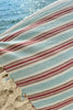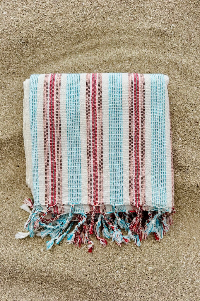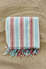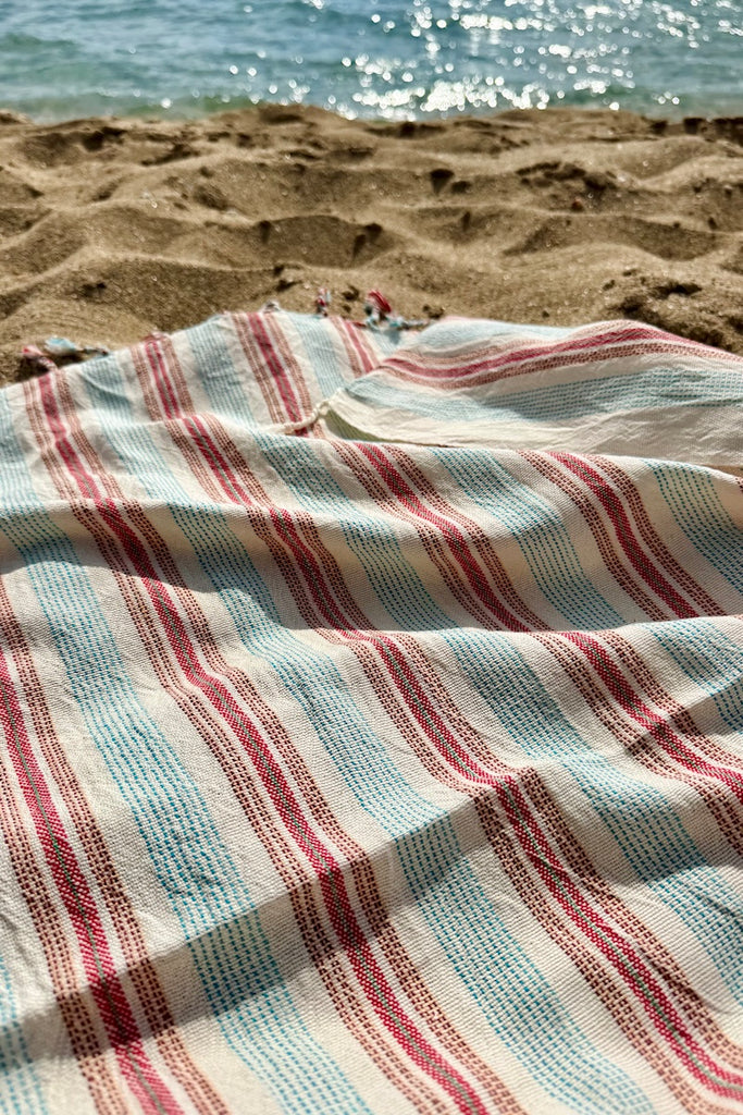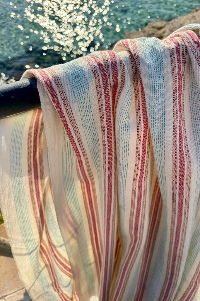 Con vibrantes rayas multicolores, nuestra toalla de playa Akasya de edición limitada está tejida en la antigua ciudad de Antakya por una familia de maestros tejedores.