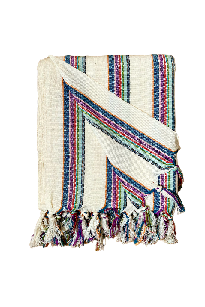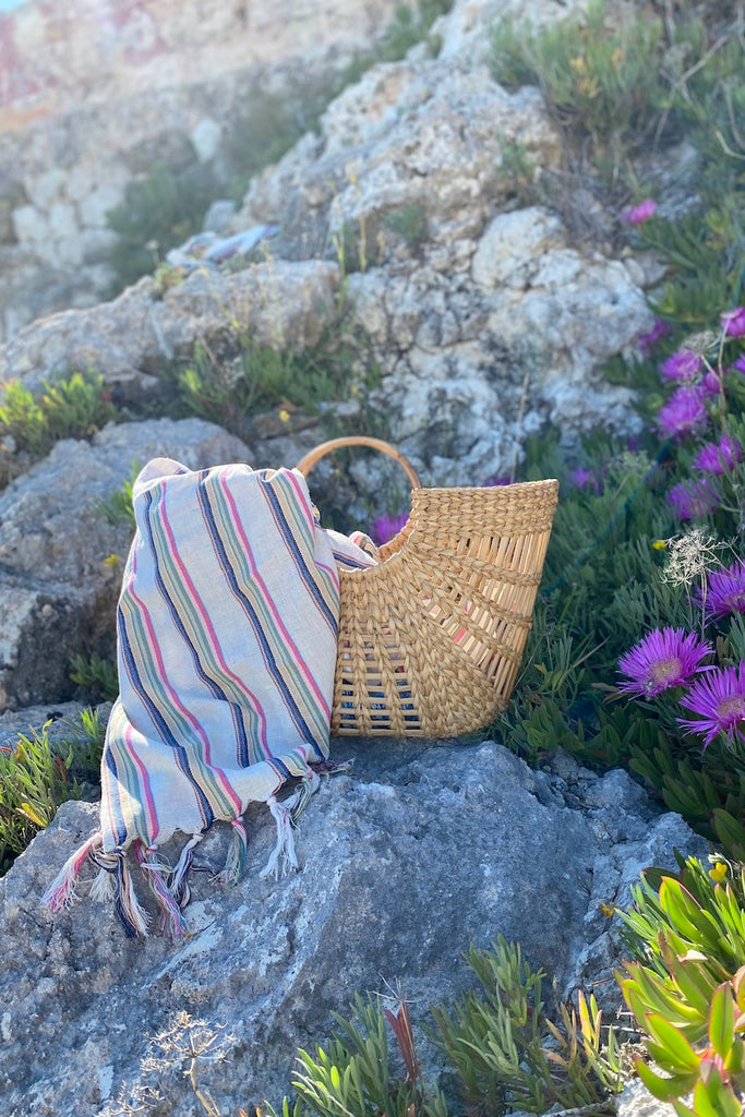 Il Myra incarna un'atmosfera retrò-mediterranea con strisce cromatiche dai toni da spiaggia. Tessuto a mano in piccoli lotti da artigiani nell'antica città di Antiochia.