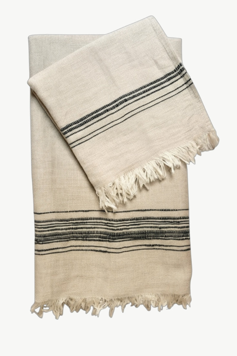 The Hera towel combines the powerful absorbency and durability of linen with the softness of cotton. Delicate stripes, eyelash fringe, and understated colors bring together the minimal-chic design. Available individually or in sets with matching large hand towel at a discount.