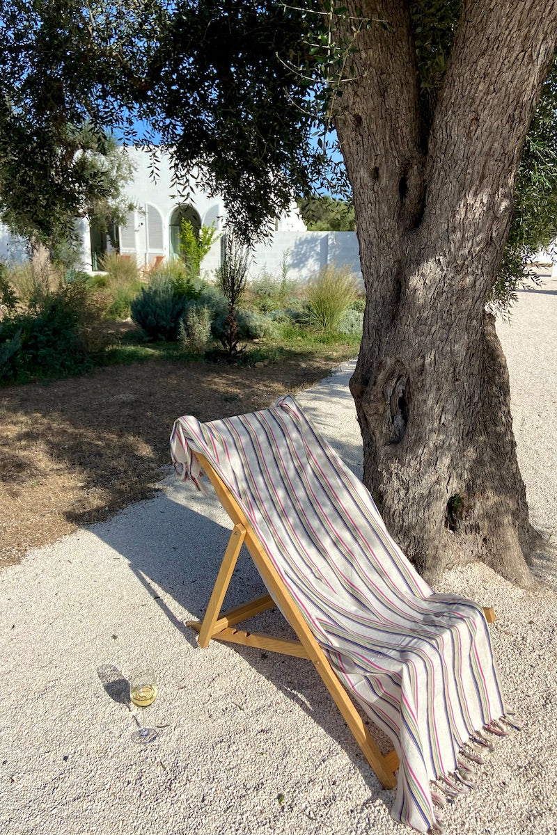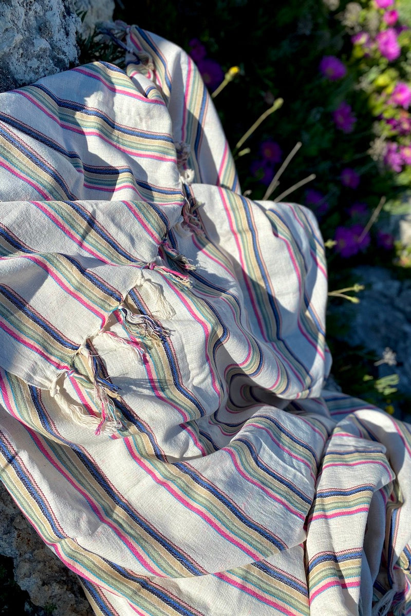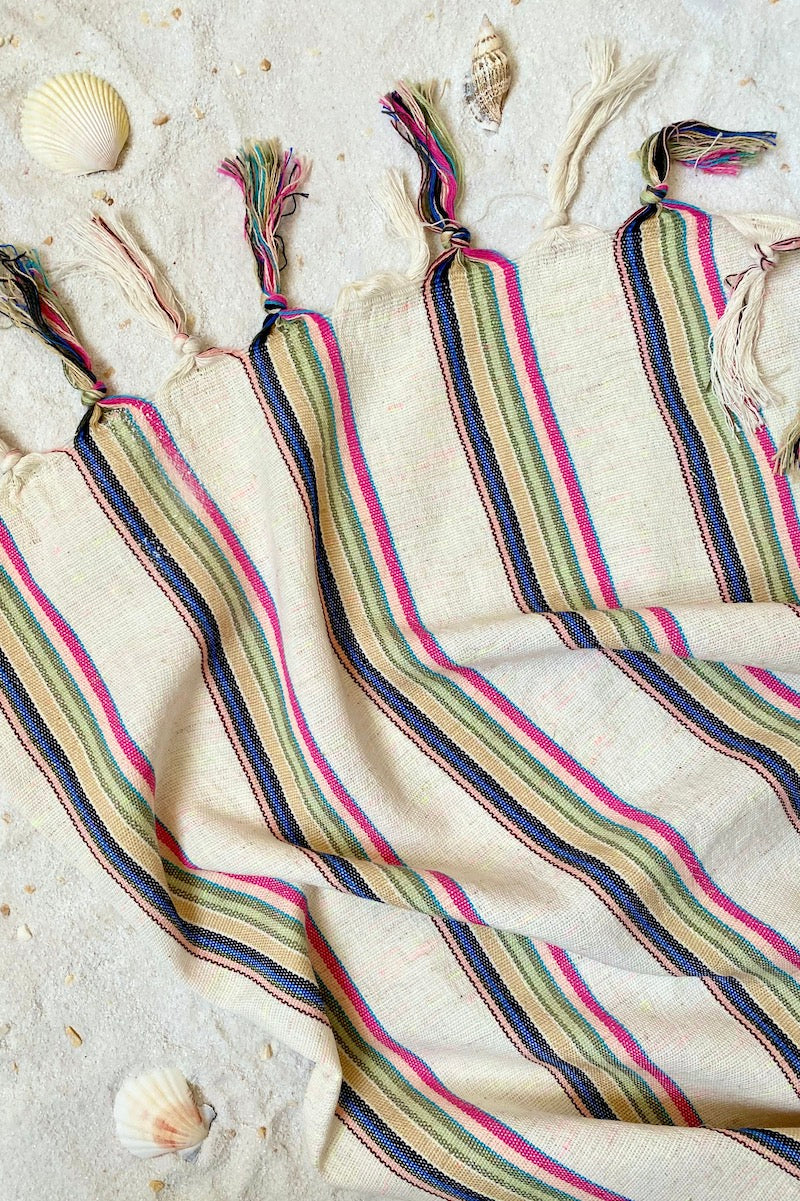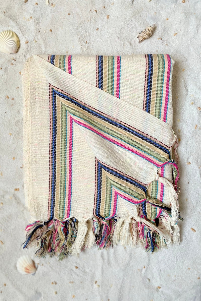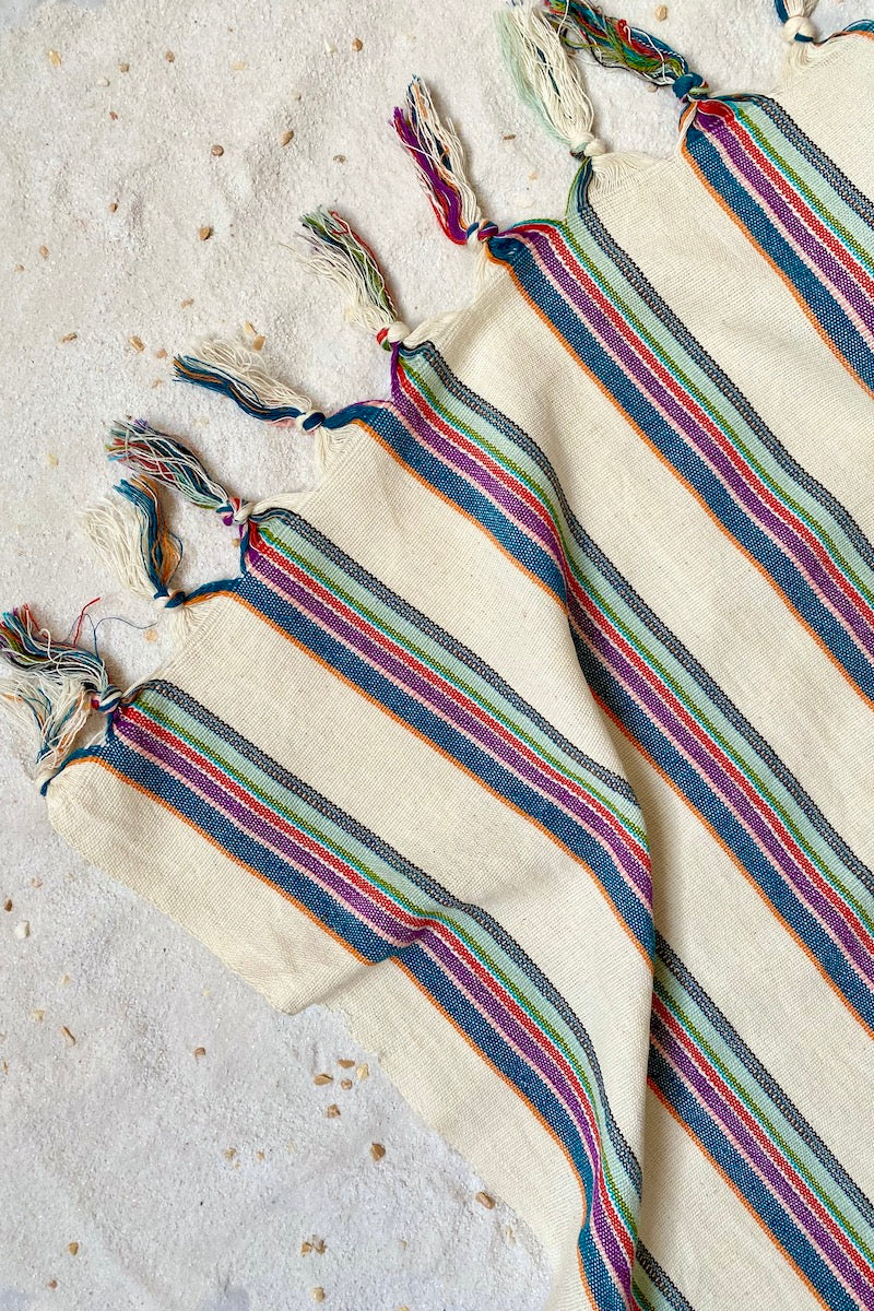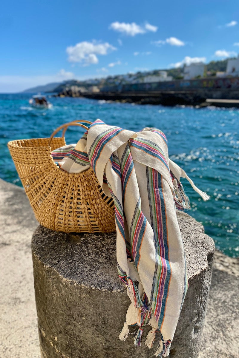 The Myra embodies a retro-Mediterranean vibe with chromatic stripes in beachy tones. Handwoven in small batches by artisans in the ancient city of Antakya.